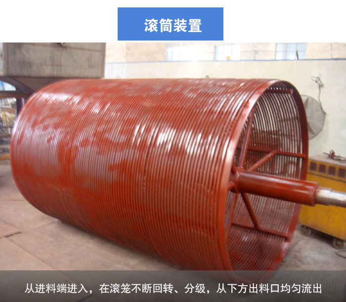 滾筒篩主要由電機、減速機、滾筒裝置、機架、密封蓋、進出料口組成。