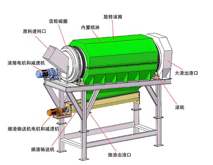 通用滾筒篩類型主要由篩筒、驅動裝置、支撐裝置、進料口、出料口及防塵罩構成。作為核心部件的篩筒,多采用鋼板焊接或沖孔板制成,筒壁篩孔大小依目標篩分粒度而定,且部分篩筒可設計為傾斜式,傾斜角度一般在 5°-15° 之間,以借重力助物料前進;驅動裝置含電機、減速器及傳動機構,可通過調電機轉速控篩筒轉速;支撐裝置的托輪支撐篩筒并保其平穩旋轉,擋輪防其軸向竄動;進料口設溜槽防物料沖擊篩筒,出料口按篩分級別設多個以分收不同粒度物料。