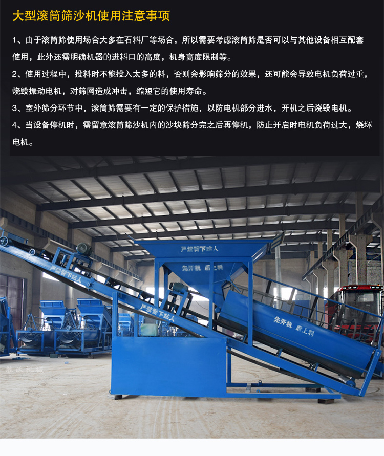 4、當設備停機時,需留意滾筒篩沙機內的沙塊篩分完之后再停機,防止開啟時電機負荷過大,燒壞電機。