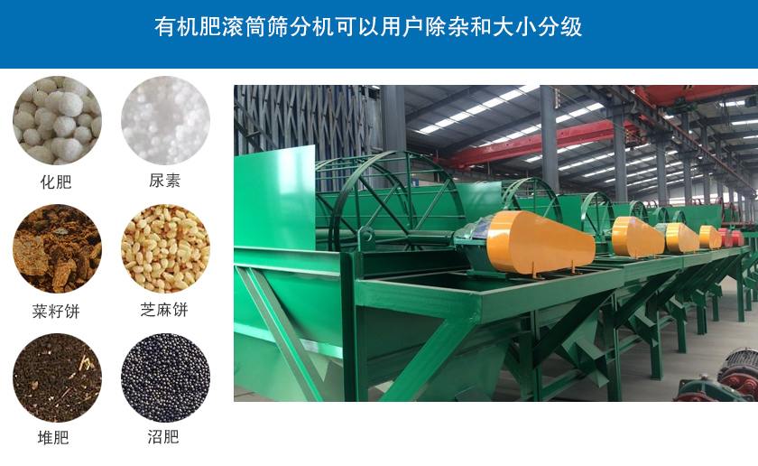 有機(jī)肥滾筒篩分機(jī)可以用戶除雜和大小分級(jí),主要用于化肥、尿素、菜籽餅、芝麻餅、堆肥、沼肥等各種有機(jī)肥料的處理。