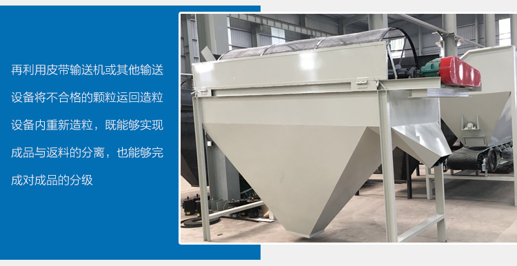 有機(jī)肥滾筒篩分機(jī)是生產(chǎn)顆粒有機(jī)肥生產(chǎn)線中的設(shè)備之一,其利用了分選技術(shù),從進(jìn)料端到出料端采用不同目數(shù)的篩網(wǎng),可將有機(jī)肥中不合格的顆粒篩分除雜,再利用皮帶輸送機(jī)或其他輸送設(shè)備將不合格的顆粒運(yùn)回造粒設(shè)備內(nèi)重新造粒,既能夠?qū)崿F(xiàn)成品與返料的分離,也能夠完成對(duì)成品的分級(jí),使成立粒度更加均勻,適用于300mm以下個(gè)各種固體顆粒篩分。