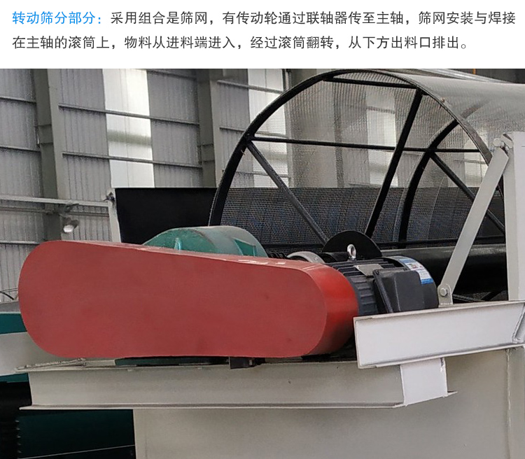 轉(zhuǎn)動(dòng)篩分部分:采用組合是篩網(wǎng),有傳動(dòng)輪通過聯(lián)軸器傳至主軸,篩網(wǎng)安裝與焊接在主軸的滾筒上,物料從進(jìn)料端進(jìn)入,經(jīng)過滾筒翻轉(zhuǎn),從下方出料口排出。