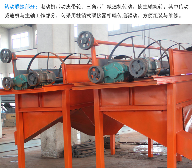轉(zhuǎn)動(dòng)聯(lián)接部分:電動(dòng)機(jī)帶動(dòng)皮帶輪、三角帶’減速機(jī)傳動(dòng),使主軸旋轉(zhuǎn),其中傳動(dòng)減速機(jī)與主軸工作部分,勻采用柱銷式聯(lián)接器相嚙傳遞驅(qū)動(dòng),方便組裝與維修。