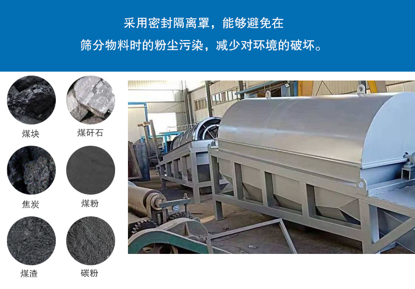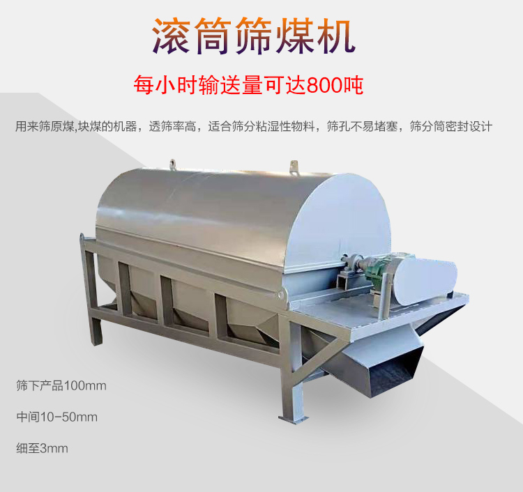 滾筒篩煤機是用來篩原煤,塊煤的機器,透篩率高,適合篩分粘濕性物料,篩孔不易堵塞,篩分筒密封設計,可以減少粉塵飛揚造成的環境污染,滾筒篩煤機篩下產品100mm,中間10-50mm,細至3mm以下,適合篩分煤塊、煤矸石、焦炭等物料。