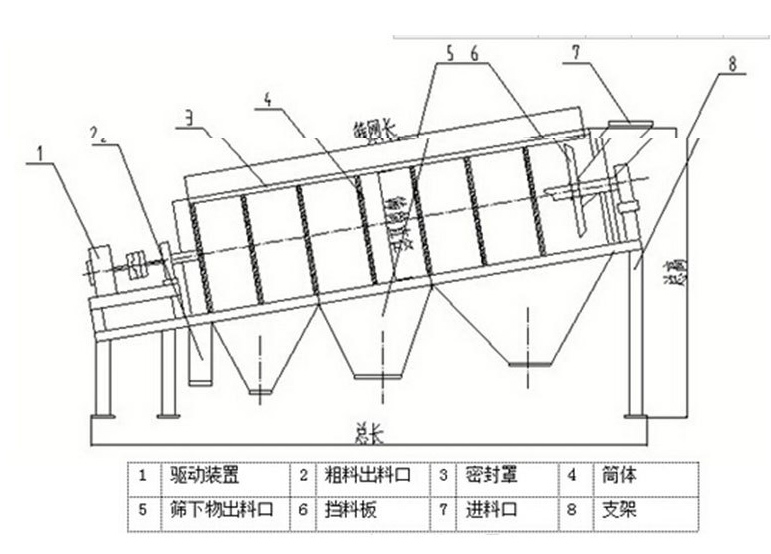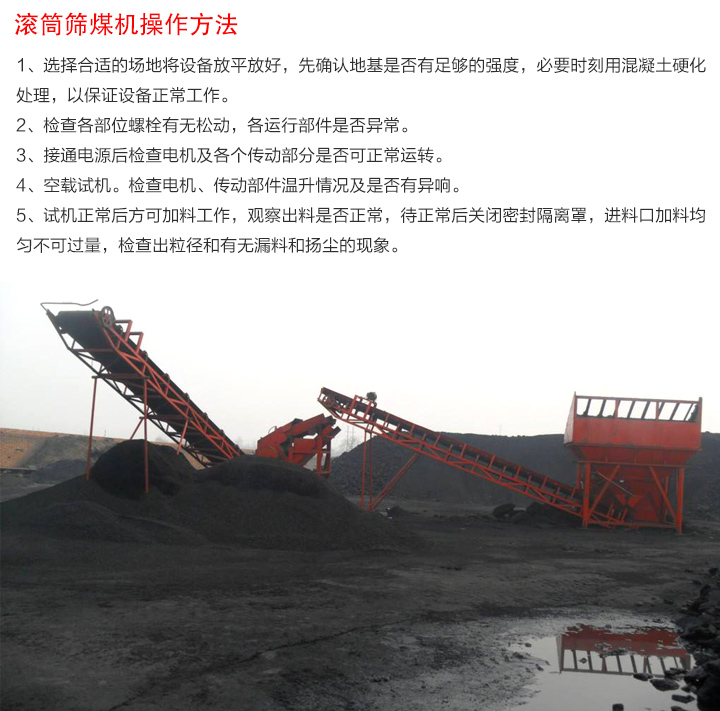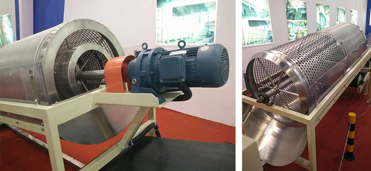 滾筒篩煤機電機經過減速機和滾筒裝置通過連軸器連接在一起,通過驅動滾筒裝置繞其軸線轉動,當物料進入滾筒裝置后傾斜與轉動,使物料不停翻轉和滾動,合格的物料經過滾筒外圓篩網排出,將不合格物料經過滾筒末端排出,物料在滾筒內來回翻轉和滾動,使得篩孔內的物料被彈出,可以防止物料堵塞。