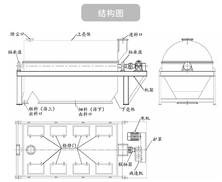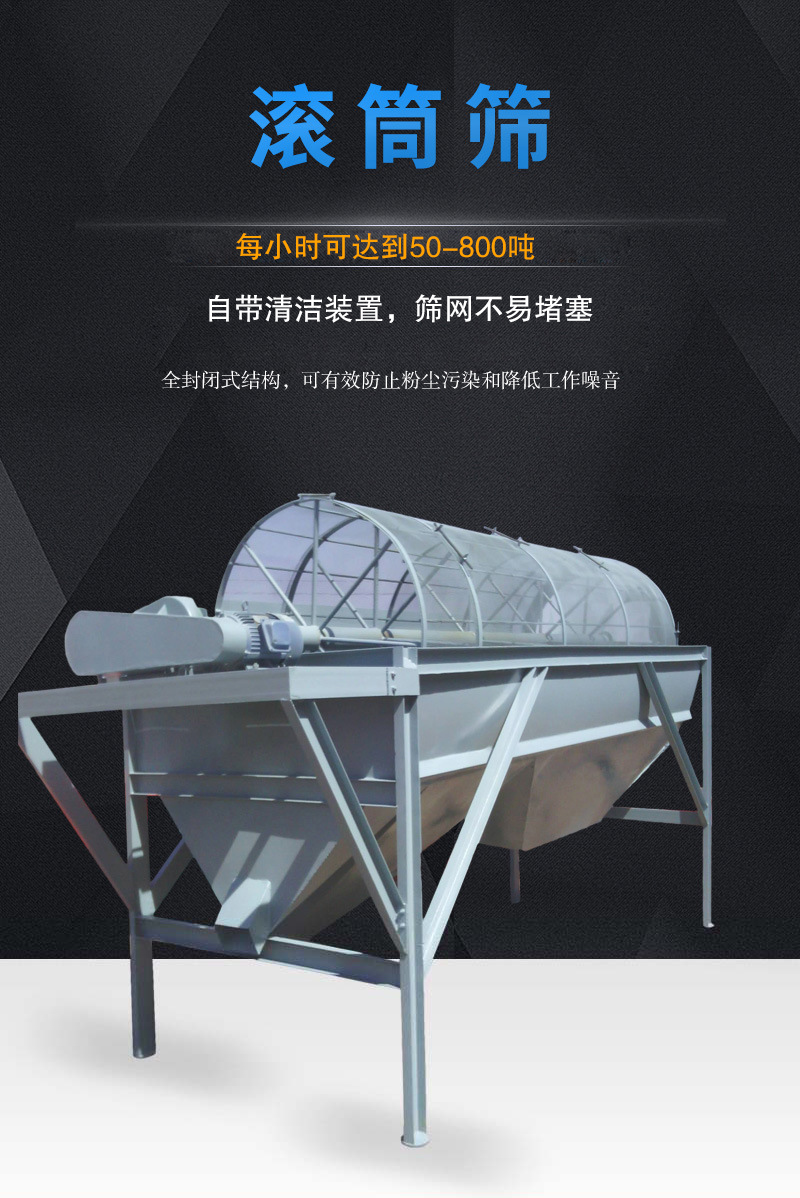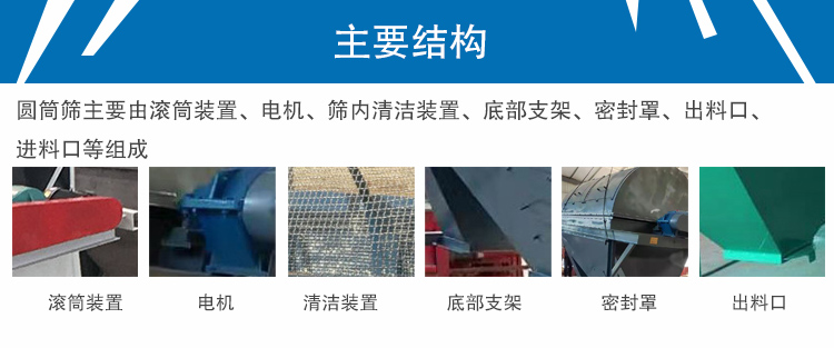 圓筒篩主要由滾筒裝置、電機、篩內清潔裝置、底部支架、密封罩、出料口、進料口等組成,筒體呈傾斜放置,并被防塵罩罩住,生產過程中幾乎無粉塵和噪音污染。