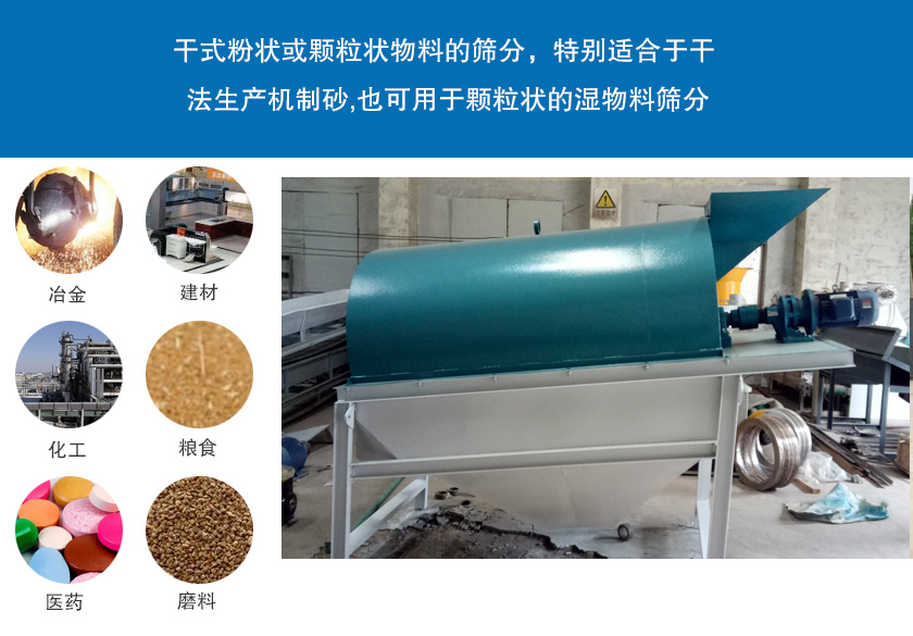 圓筒篩主要是針對物料的顆粒大小進行分級,在篩分潮濕性、粘附性的物料中優勢突出,可以達到不粘網、不堵孔的目的,圓筒篩可廣泛應用于冶金、建材、化工、糧食、醫藥、磨料及化肥等行業的干式粉狀或顆粒狀物料的篩分,特別適合于干 法生產機制砂,也可用于顆粒狀的濕物料篩分。