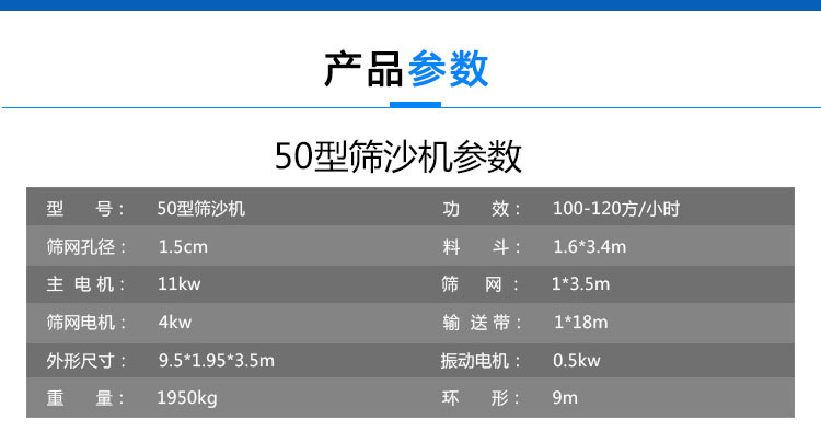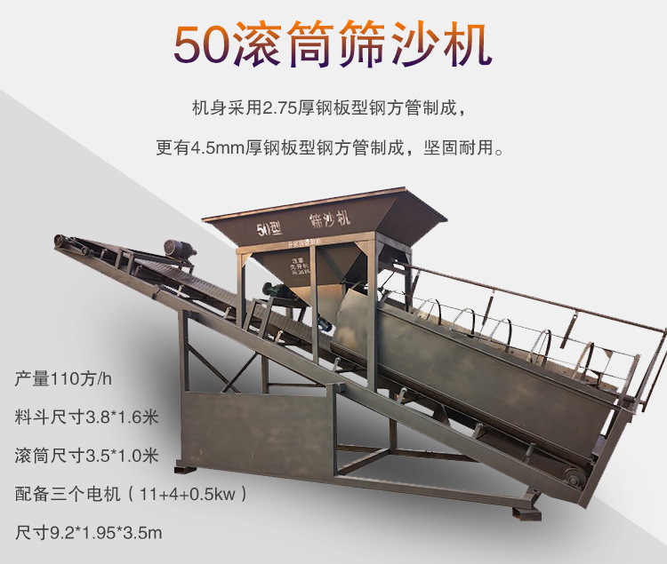 50滾筒篩沙機(jī)作為篩沙機(jī)中比較大的一款,性價(jià)比高,產(chǎn)量110方/h,料斗尺寸3.8*1.6米,滾筒尺寸3.5*1.0米,配備三個(gè)電機(jī)(11+4+0.5kw),尺寸9.2*1.95*3.5m,機(jī)身采用2.75厚鋼板型鋼方管制成,更有4.5mm厚鋼板型鋼方管制成,堅(jiān)固耐用。