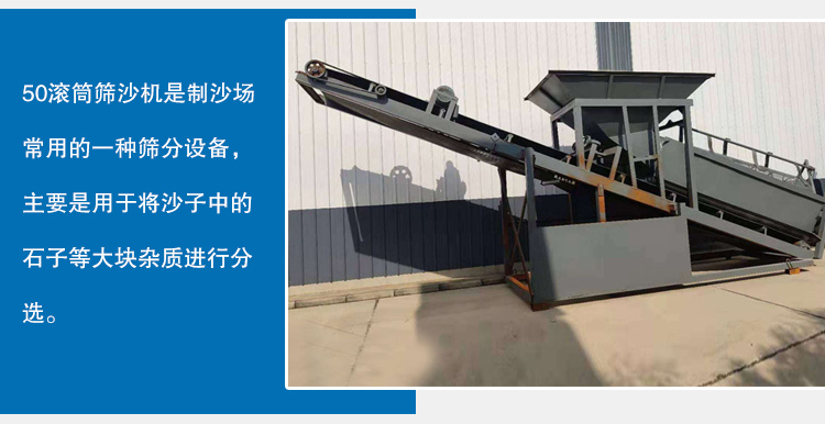50滾筒篩沙機(jī)是制沙場(chǎng)常用的一種篩分設(shè)備,主要是用于將沙子中的石子等大塊雜質(zhì)進(jìn)行分選。
